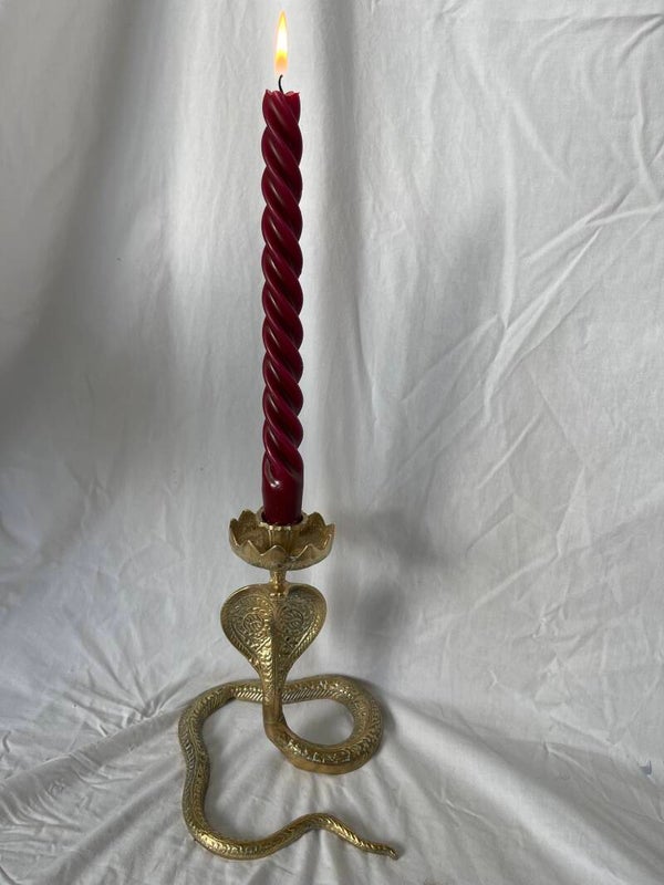 Bougeoir unique en laiton en forme de majestueux cobra, mesurant 16 cm de hauteur. Ce modèle captivant et détaillé est parfait pour une décoration audacieuse et exotique. Idéal pour les amateurs de pièces décoratives intrigantes et symboliques.