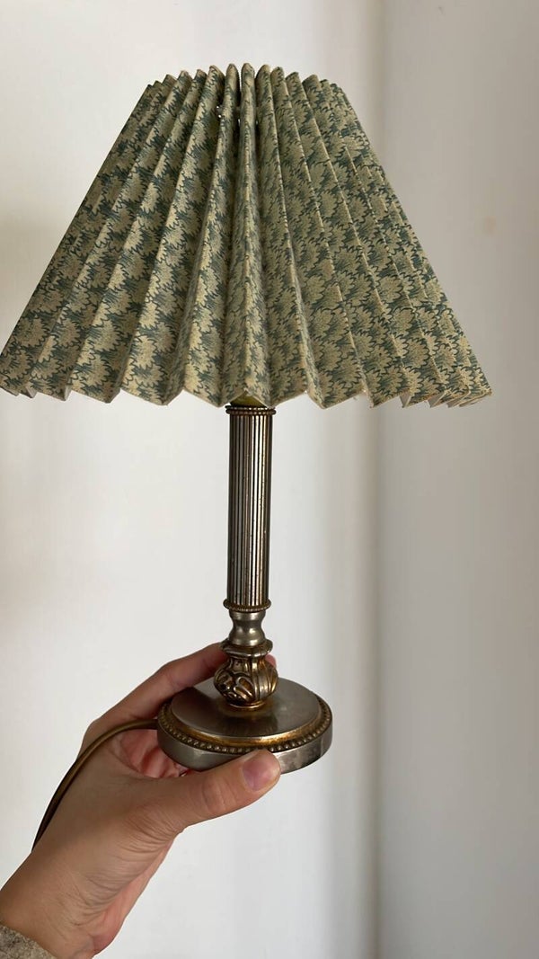 Cette élégante lampe en laiton, ornée d’un abat-jour plissé en carton aux motifs délicats, reflète l’esthétique raffinée des années 1950. Elle apporte une lumière douce et chaleureuse, parfaite pour créer une ambiance vintage et élégante dans votre intérieur.