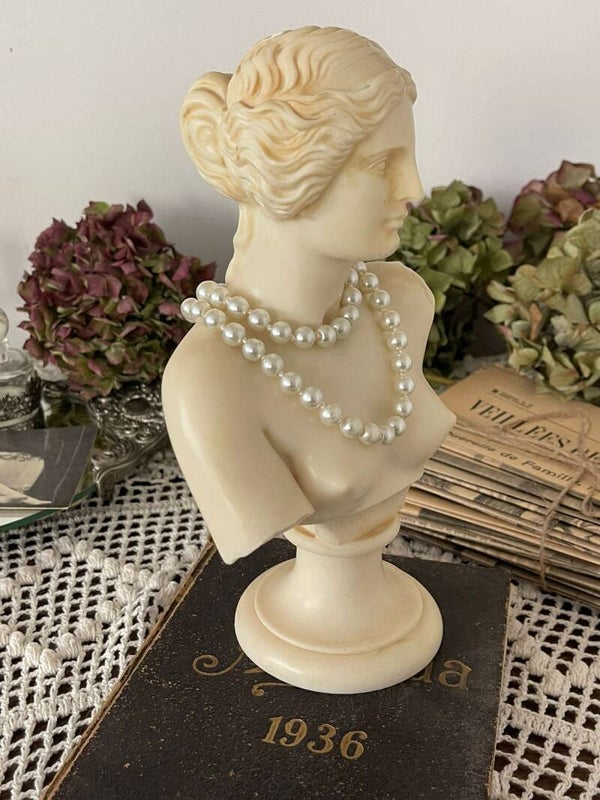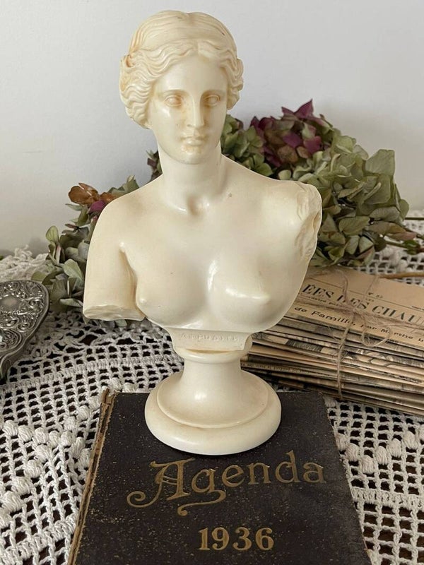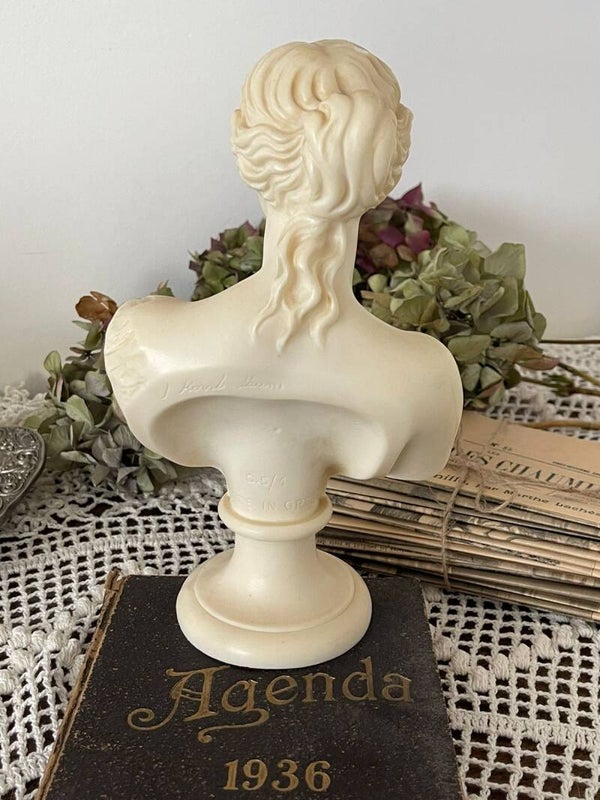 Ce magnifique petit buste célèbre la déesse Aphrodite, ou « Ἀφροδίτη » en grec ancien, incarnation de la beauté et de l’amour éternels. Fabriqué en Grèce, comme l’indique l’inscription "Made in Greece", il est conçu en résine blanche et affiche des dimensions harmonieuses de 22 cm de hauteur sur 14 cm de largeur.