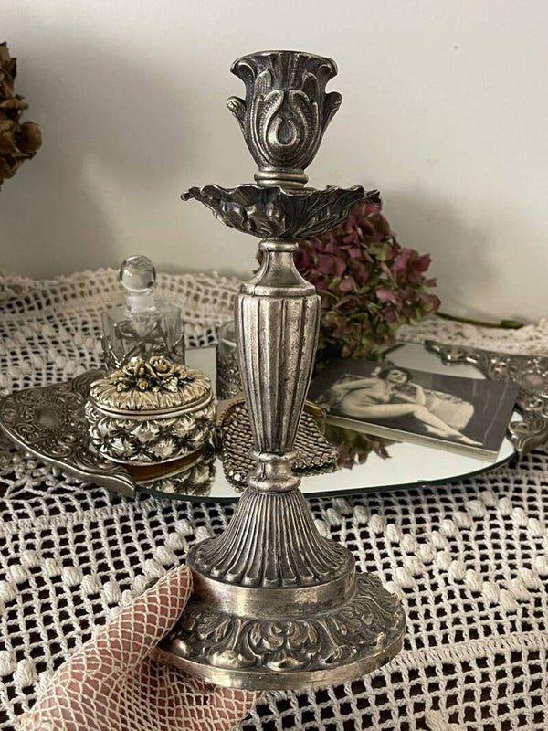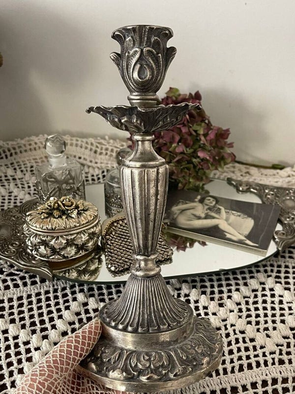 Ce bougeoir en étain argenté, d’une hauteur élégante de 25 cm, capture avec finesse l’essence du style Louis XVI. Avec ses lignes droites, ses cannelures et ses ornements classiques inspirés de l’Antiquité, il illustre parfaitement l’élégance et la symétrie caractéristiques de cette époque.