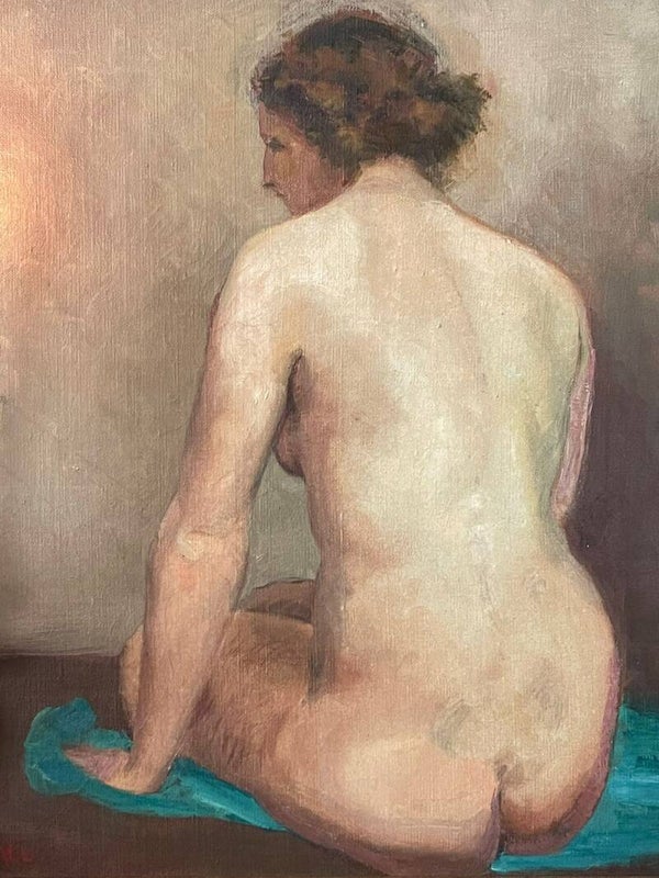 Ce tableau représentant un nu féminin, une femme assise de dos sur un tissu bleu turquoise, incarne une belle simplicité. La douceur des couleurs de fond, principalement des tons marron et beige, met en valeur la peau délicate de la figure féminine qui regarde vers le bas. La scène dégage une ambiance calme et introspective, accentuée par l’utilisation subtile des couleurs et des ombres.