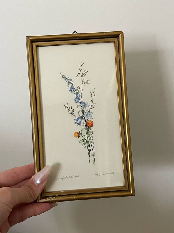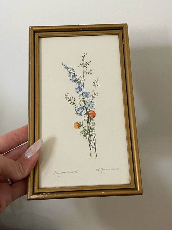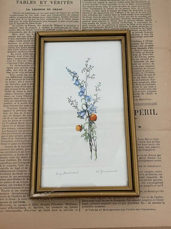 Cette délicate petite œuvre, mesurant 19 cm sur 11 cm, représente un brin de fleurs bleues en clochette et deux boules de fleurs orangées, agrémentées de brins crémeux. La composition, légère et printanière, évoque l’esprit d’un herbier champêtre, où la nature se dévoile dans toute sa simplicité et sa fraîcheur.