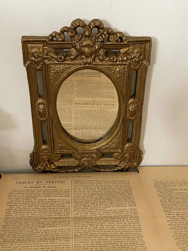 Ce miroir ovale est encadré par une structure rectangulaire ornée de motifs floraux, avec une couronne délicate en haut, rappelant le style baroque. Le matériau, semblant être de la résine, apporte une texture particulière à l’ensemble. Les détails, un peu grossiers, lui confèrent toutefois un charme unique et intemporel. Idéal pour apporter une touche d’élégance ancienne à n’importe quel espace, ce miroir ajoute une note décorative vintage tout en restant accessible.