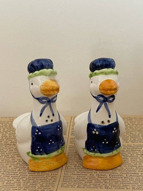 Ce charmant duo en céramique blanche représente deux oies prêtes à mettre du goût dans vos plats et de la fantaisie sur votre table. Coiffées d’une toque bleue soulignée d’un fin liseré vert, elles portent un tablier bleu bordé de vert et arborent un petit nœud bleu autour du cou. Leurs pattes et leur bec jaunes ajoutent une touche vive à l’ensemble.