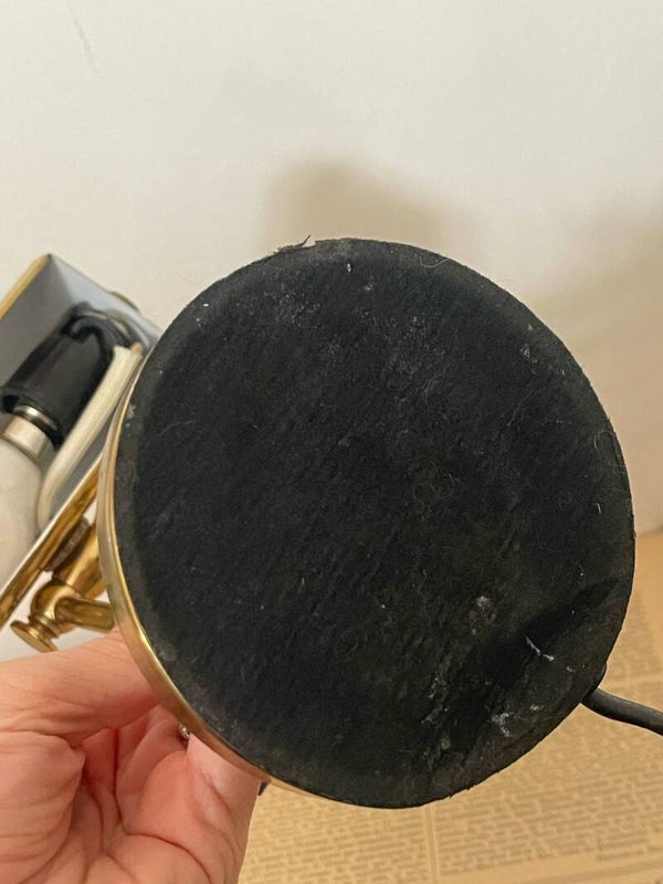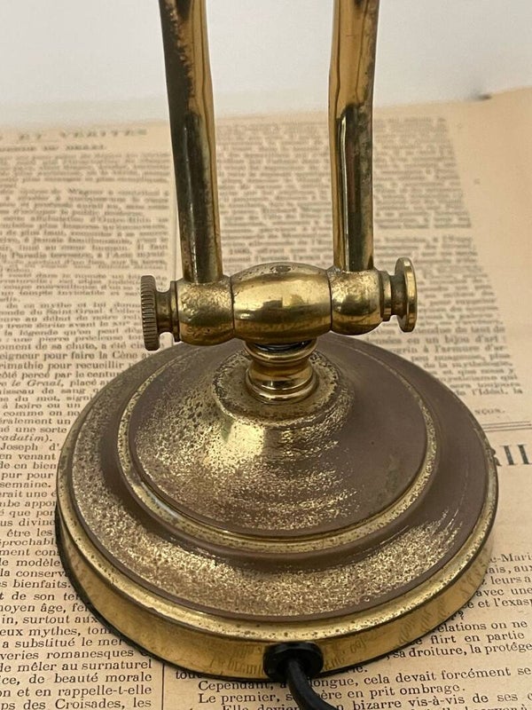 Son état légèrement patiné, avec quelques traces d'usure et des piqûres visibles, n'altère en rien son caractère unique. Au contraire, ces marques du temps lui confèrent une âme, témoignage de son histoire et de sa longévité. Chaque détail semble raconter une histoire, faisant de cette lampe un véritable objet de collection ou un joli élément décoratif.