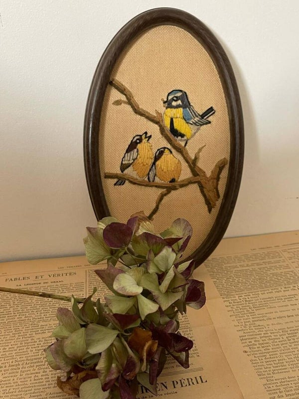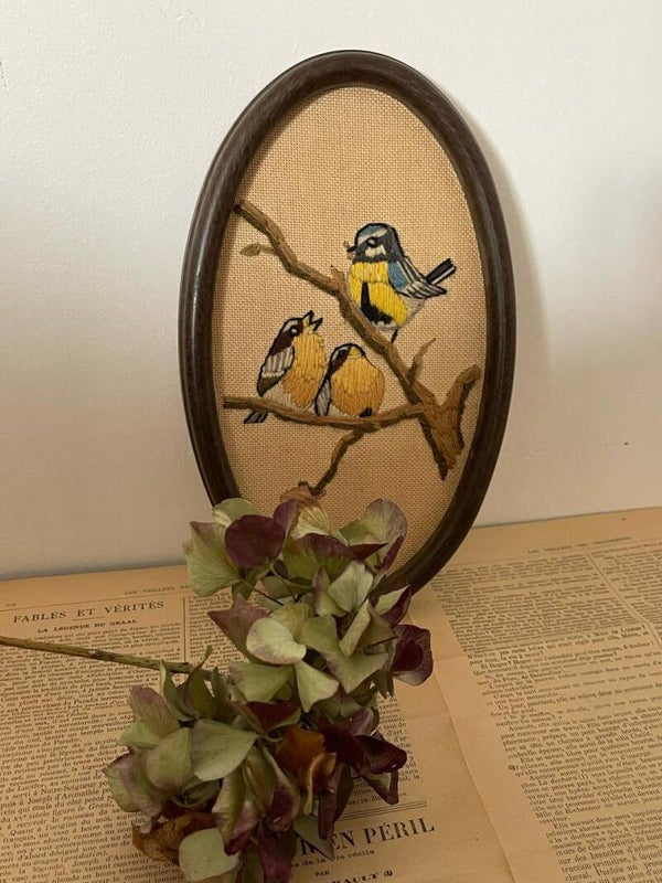 Un soupçon de nature s’invite sur vos murs avec ce délicat cadre ovale en bois, abritant une toile brodée à la main. Sur une branche aux teintes chaudes de brun, trois oiseaux se posent : deux compagnons en beige et marron se partagent le bas, tandis qu’un petit curieux aux plumes jaunes, bleues et grises surveille la scène depuis les hauteurs. Une broderie pleine de tendresse, parfaite pour une déco champêtre ou vintage.