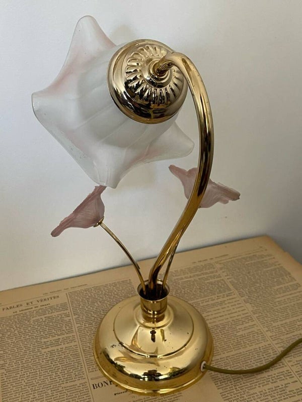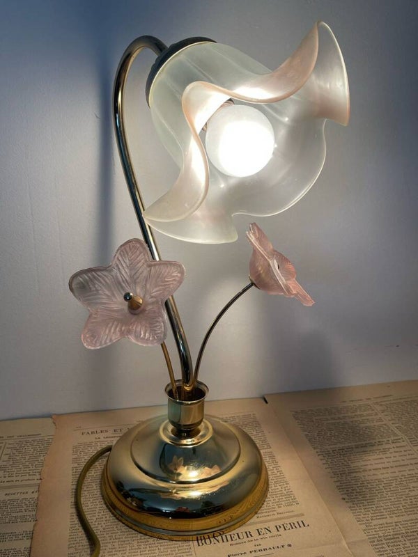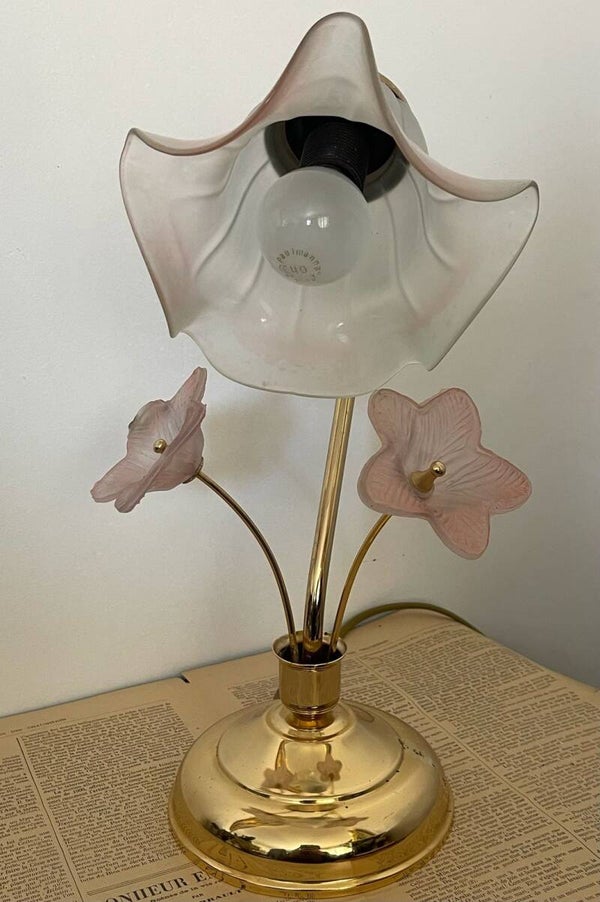 Avec ses courbes délicates et son abajour en forme de fleur, cette lampe à poser nous murmure des souvenirs des années 80, dans un souffle romantique. Le pied doré, élancé comme un col de cygne, accueille un élégant abat-jour en verre aux bords ondulés, évoquant les jupons d'une ballerine en plein mouvement. Et comme un secret bien gardé, deux petites fleurs en verre rose, perchées sur leurs tiges dorées, viennent parfaire la scène et lui confèrent une touche unique. Une lampe douce et poétique, parfaite pour une table de chevet ou un coin lecture.