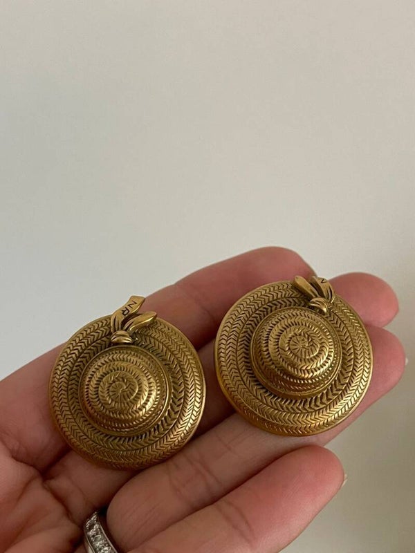 Pépite vintage pleine de charme, cette paire de boucles d’oreilles à clips signée Nina Ricci évoque l’élégance ensoleillée d’un après-midi au jardin. En forme de petits chapeaux de paille dorés, elles sont finement texturées pour imiter les brins entrelacés, et ornées d’un ruban délicat sur lequel figurent les initiales NR. Au dos, la signature gravée et le copyright attestent de leur authenticité. Une touche rétro et raffinée pour illuminer votre visage avec douceur.