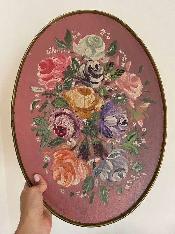 Avec son fond rose poudré et ses teintes vibrantes, ce tableau ovale (43 x 34 cm) peint sur bois respire la poésie. La composition florale mêle harmonieusement une fleur orange, une grise, une violette, une rouge, une jaune, une noire, deux nuances de rose et une touche de vert, le tout entouré d’un foisonnement de petites feuilles. Chaque détail semble danser sur le bois, apportant une note bohème, joyeuse et libre. Une pièce pleine de douceur et de caractère, idéale pour enchanter un mur.