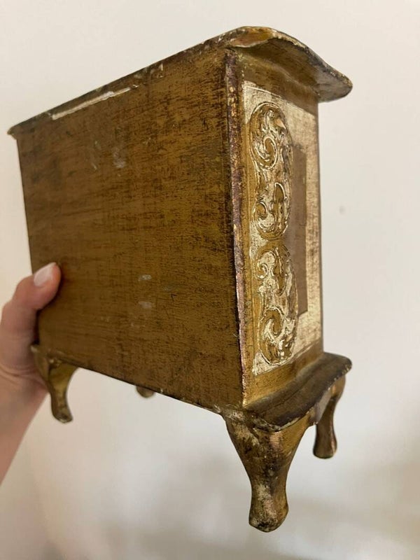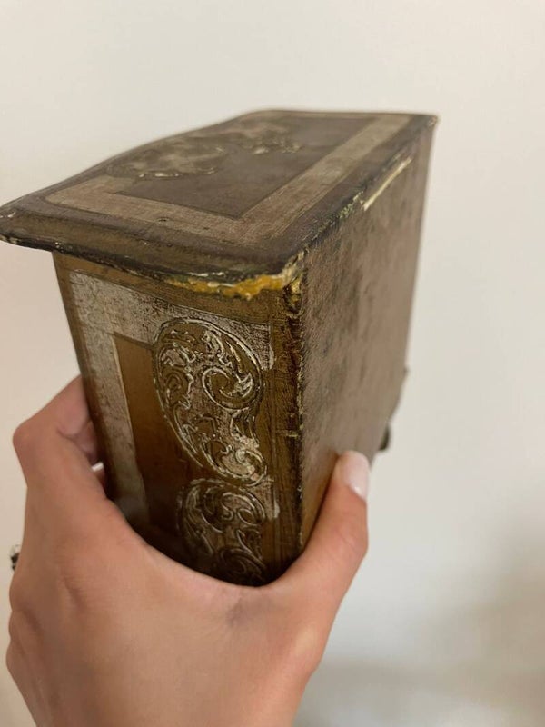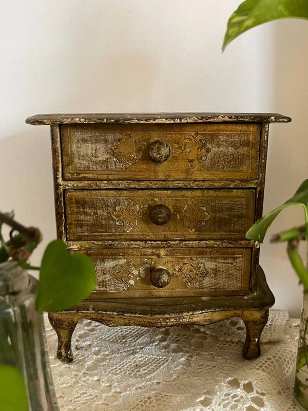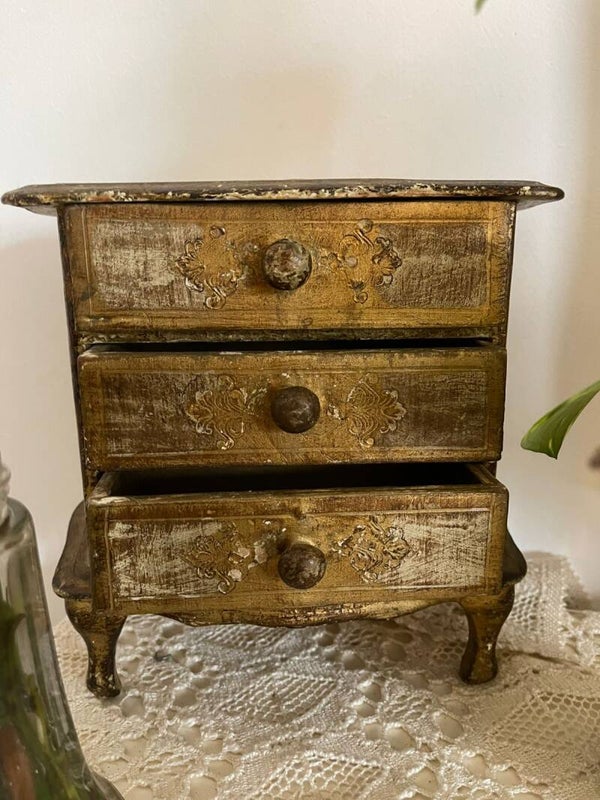 Avec ses dimensions modestes (15 x 18 cm) et son style vénitien délicieusement vieilli, cette petite commode à poser dégage un charme tout particulier. Composée de trois tiroirs, elle se place idéalement sur une table ou une étagère, comme un précieux coffret. Sa patine dorée, écaillée par le temps, raconte une histoire ancienne, et les ondulations visibles sur le bois témoignent de son vécu. Une pièce poétique, à la fois décorative et pratique, parfaite pour y glisser des trésors.