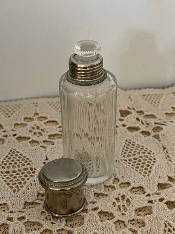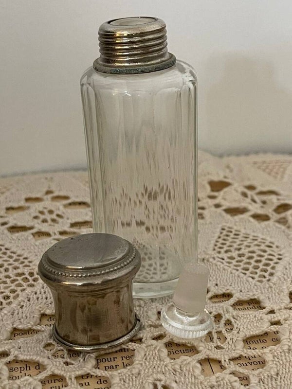 Ce flacon en verre, tout comme son prédécesseur, mesure 10 cm de hauteur, mais se distingue par son bouchon de forme plus classique : arrondi, mais avec une base carrée, presque en forme de petit tube. Ce bouchon raffiné est orné d’un petit liseré, apportant une touche d’élégance discrète à l’ensemble. À l’intérieur, un bouchon en verre vient s’ajuster délicatement entre les deux éléments métalliques, ajoutant à ce flacon un charme unique et un souci du détail qui fait toute la différence. Une pièce simple mais sophistiquée.