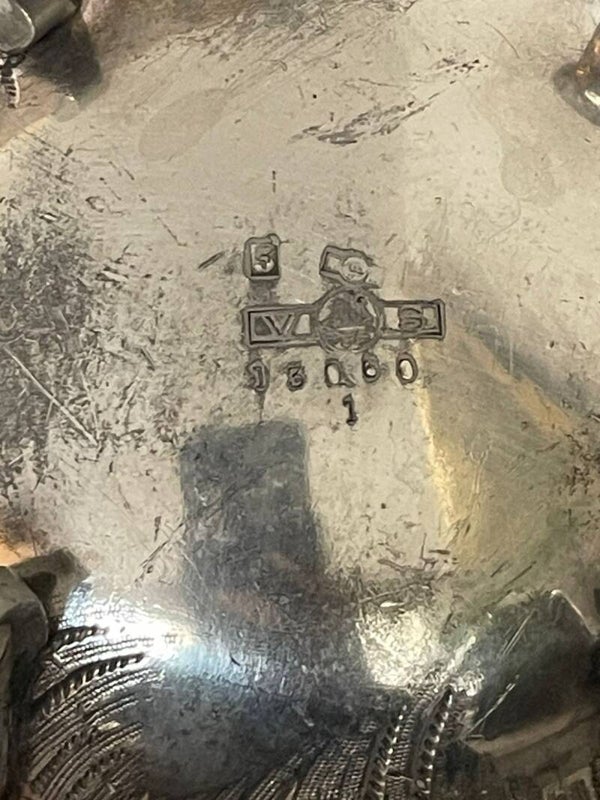 Des gravures anciennes ornent la surface, ajoutant une touche de raffinement à cette pièce pleine de caractère. Bien que des poinçons soient visibles en dessous, ils n’ont pas permis de confirmer une fabrication en argent massif — il s’agit très vraisemblablement de métal argenté.