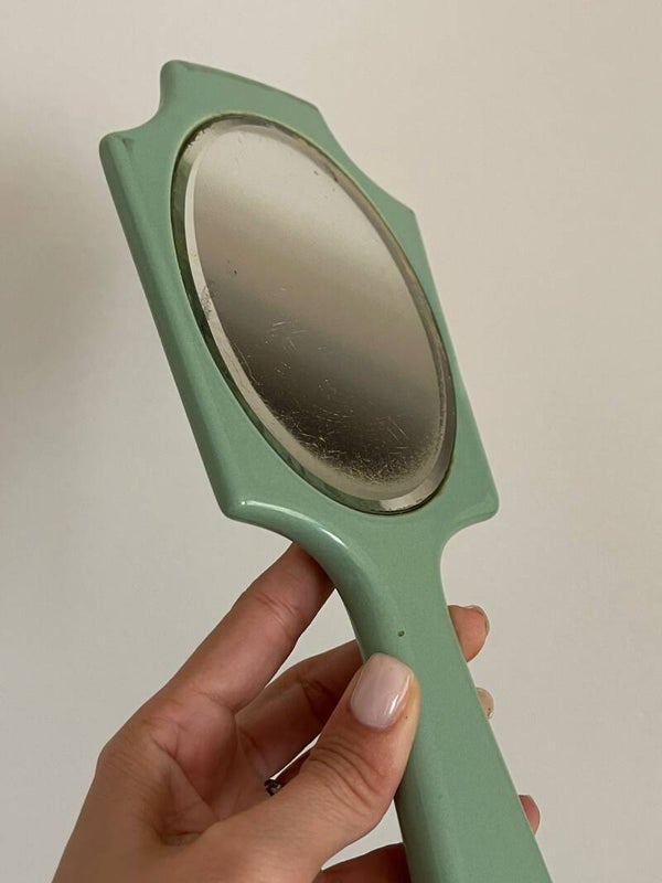 Ce miroir de poche, mesurant 25 cm de hauteur sur 9 cm de largeur, incarne parfaitement l'esthétique rétro des années 70/80. Le verre présente quelques rayures légères, mais cela ajoute à son caractère. Le dos du miroir est décoré de petites fleurs, délicates et colorées. Sa teinte vert d'eau, simple et élégante, rappelle les tendances des années passées.