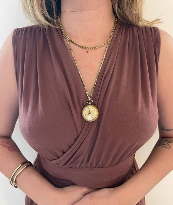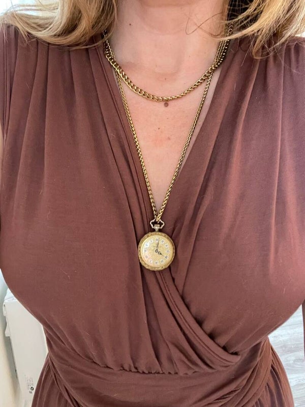 Une chaîne en acier inoxydable a été ajoutée pour permettre un port moderne en bijou. Elle n’est pas d’époque, mais s’accorde harmonieusement avec l’esprit de la montre.