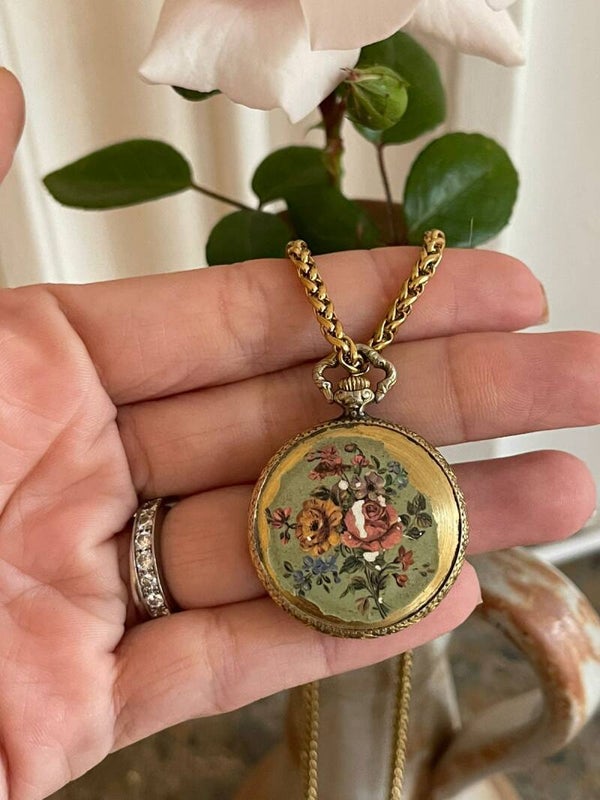 À l’arrière, un décor floral aux teintes bohèmes (roses, lilas, feuillages...) est appliqué sur un revêtement papier collé, aujourd’hui partiellement usé, témoignant de son ancienneté. Le reste du boîtier, probablement plaqué or, est en excellent état de conservation, avec une belle brillance qui met en valeur les détails ciselés.