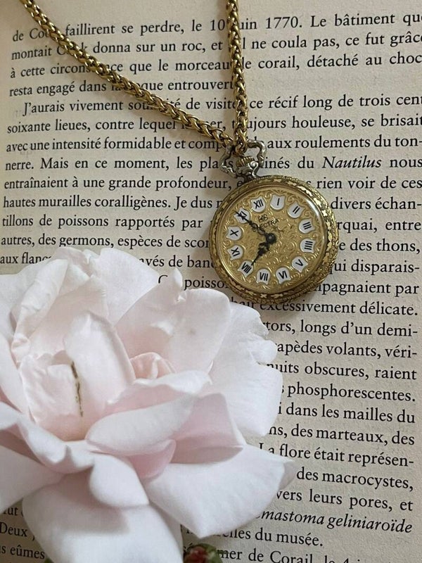 Le cadran, quant à lui, est ponctué de chiffres romains sur fond blanc, chacun encadré dans de petites cases, renforçant encore l’allure romantique et précieuse de cette pièce. Le mécanisme est entièrement fonctionnel et de type mécanique : pour la faire fonctionner, il suffit de remonter régulièrement la goupille située au-dessus de la montre, qui permet également de régler l’heure.