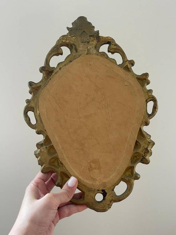 Ce miroir ancien évoque le faste d’un intérieur d’autrefois, avec son cadre en bois sculpté rehaussé d’une dorure patinée. Chaque volute, chaque fleur en relief semble raconter une histoire oubliée. Le miroir central, en excellent état, capte la lumière avec douceur. Quelques petites réparations discrètes ont redonné toute sa solidité à cette pièce pleine de caractère. Il mesure 34 cm de long pour 22 cm de large au point le plus large, et peut s’accrocher au mur sans problème.