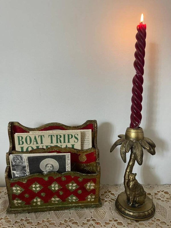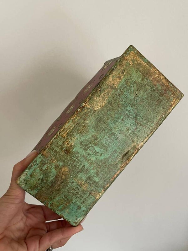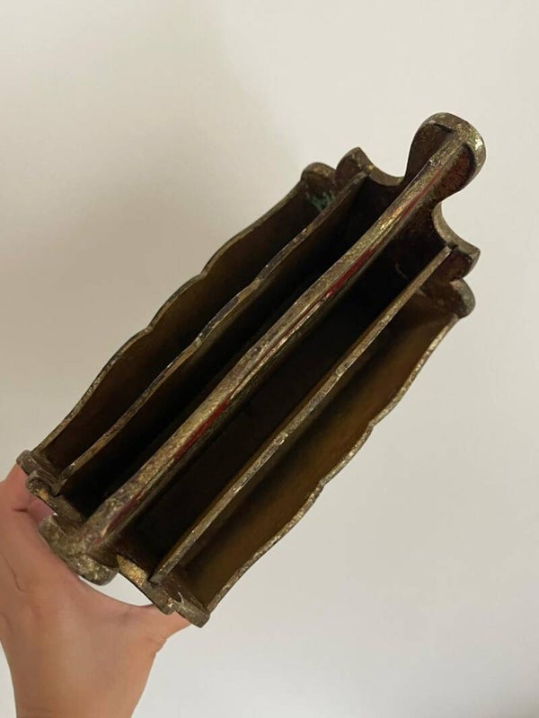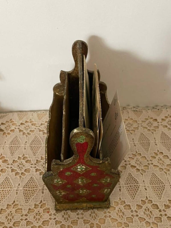 Avec son fond rouge profond et ses arêtes finement rehaussées de doré, ce porte-documents ancien incarne tout le raffinement du style vénitien. Il présente quatre compartiments – deux de chaque côté – organisés en parfaite symétrie, offrant une belle capacité de rangement tout en restant décoratif.
