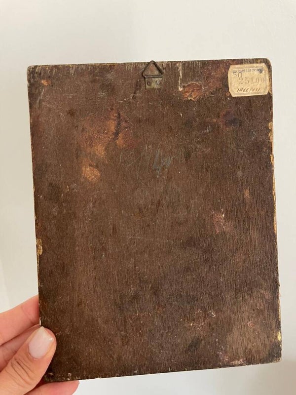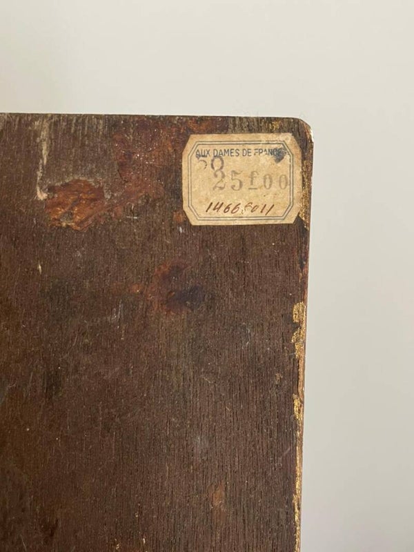 Le cadre, en bois contreplaqué, présente au dos une étiquette d’origine marquée « Aux Dames de France » avec un prix indiqué en francs (25 F), ce qui témoigne de son ancienneté. Un détail précieux qui en dit long sur l’histoire de cet objet chargé de sérénité et d’émotion.