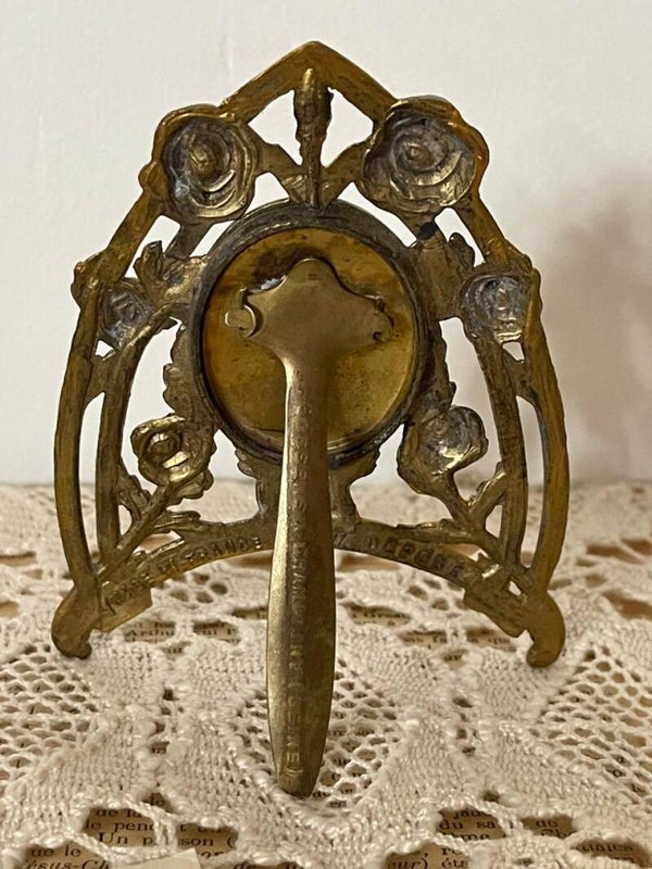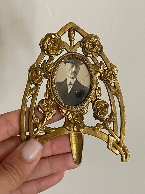 Ce cadre photo ancien, d'environ 20 cm de haut sur 8 cm de large, se distingue par sa forme triangulaire aux angles arrondis, une silhouette peu commune qui attire immédiatement l'attention. Probablement en laiton, il arbore des motifs floraux et géométriques finement travaillés, évoquant un style Art Nouveau ou Art Déco. Un petit pied à l'arrière permet de le poser élégamment sur une surface plane.