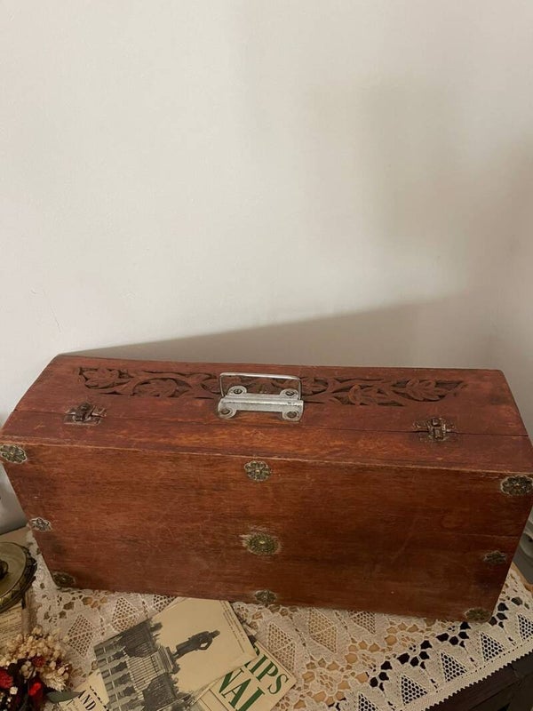 Le couvercle est décoré de neuf petites décorations rondes en forme de fleurs, ajoutant un détail délicat au design global. Des motifs floraux sont gravés sur le devant, soulignant le travail artisanal de cette pièce. L'ensemble de la boîte conserve un charme certain, grâce à son aspect vieilli et ses éléments d'origine qui racontent une belle histoire.