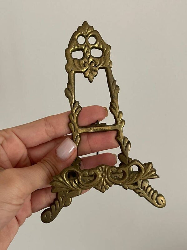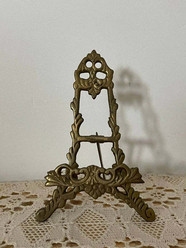 Voici un objet aussi rare que poétique : un petit chevalet ancien en laiton (ou bronze), haut d’environ 14 à 15 cm, délicatement ouvragé. Son décor floral foisonnant, presque baroque, lui donne une allure romantique irrésistible. Il est parfait pour accueillir une photo, un dessin, une carte ou tout autre trésor à mettre en valeur.