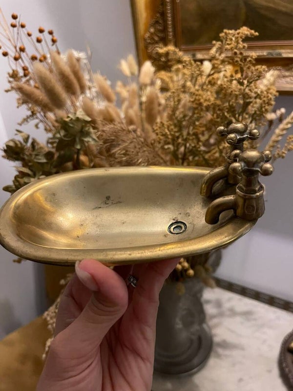 Voici un objet aussi surprenant que charmant : un porte-savon en laiton en forme de petite baignoire, avec ses deux petits robinets — l’un pour l’eau chaude, l’autre pour l’eau froide — délicatement représentés. On y dépose son savon comme on plongerait dans un bain miniature, et l’eau s’évacue par un petit trou discret à la base, fidèle à l’esprit fonctionnel de l’objet.