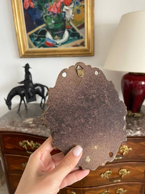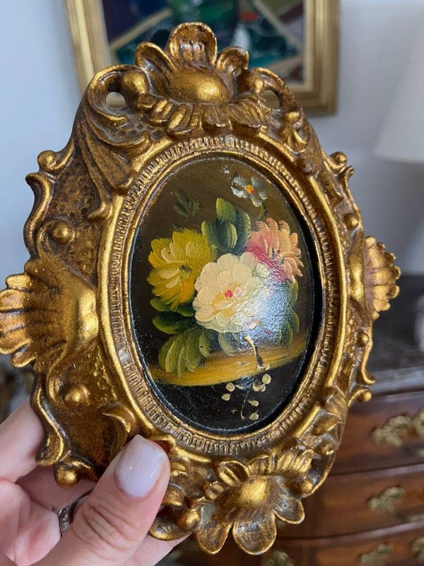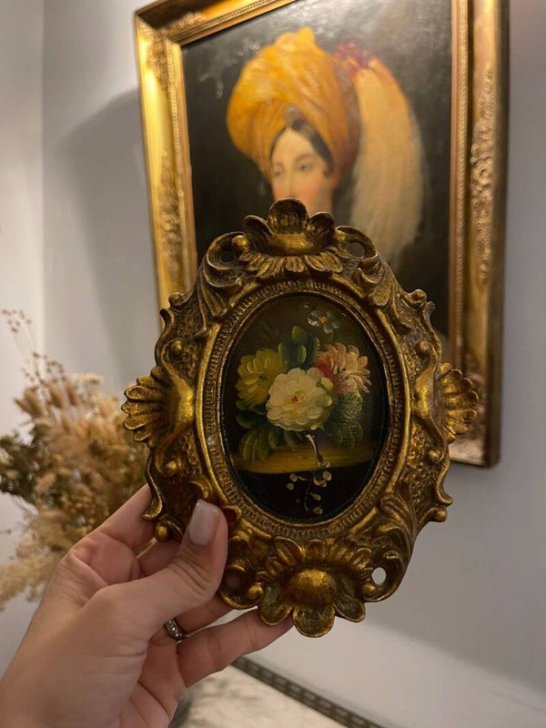 En son centre, un ovale bombé accueille une peinture à la main représentant un bouquet de fleurs sur un fond noir-jaune, presque clair-obscur. Cet effet donne de la profondeur à la composition, renforçant le caractère unique de l’objet. L’accroche ancienne à l’arrière atteste de son âge et de son authenticité. Un cadre original et rare, idéal pour sublimer un mur avec goût et singularité.