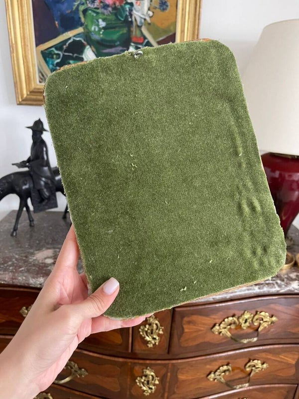 Voici un cadre délicat, à l’élégance discrète, mais au charme indéniable. De forme rectangulaire aux bords arrondis, il présente un liseré intérieur et de légers reliefs floraux en haut et en bas, comme une signature discrète d’un autre temps. Ni trop chargé ni trop simple, il évoque avec justesse le raffinement des objets anciens.