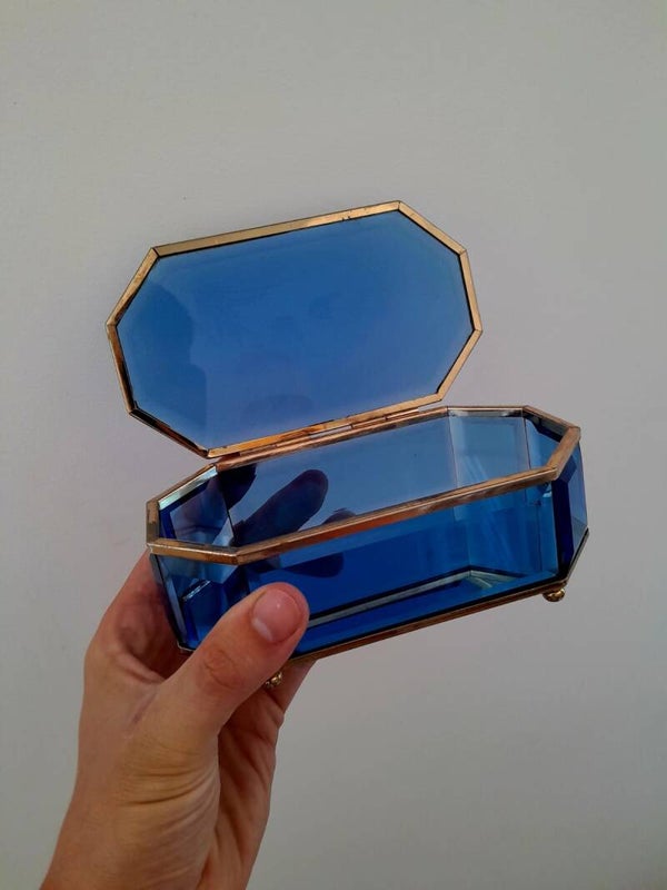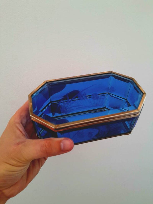 Ce superbe coffret à bijoux des années 1950 conjugue raffinement et savoir-faire. Entièrement réalisé en verre bleu cobalt biseauté, il est encadré d’un cerclage en laiton doré qui souligne la pureté de ses lignes géométriques. Le couvercle est orné d’un motif floral délicatement gravé à l’intérieur du verre, ajoutant une touche de poésie à l’ensemble.