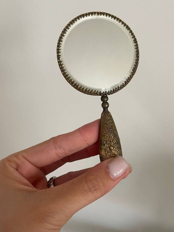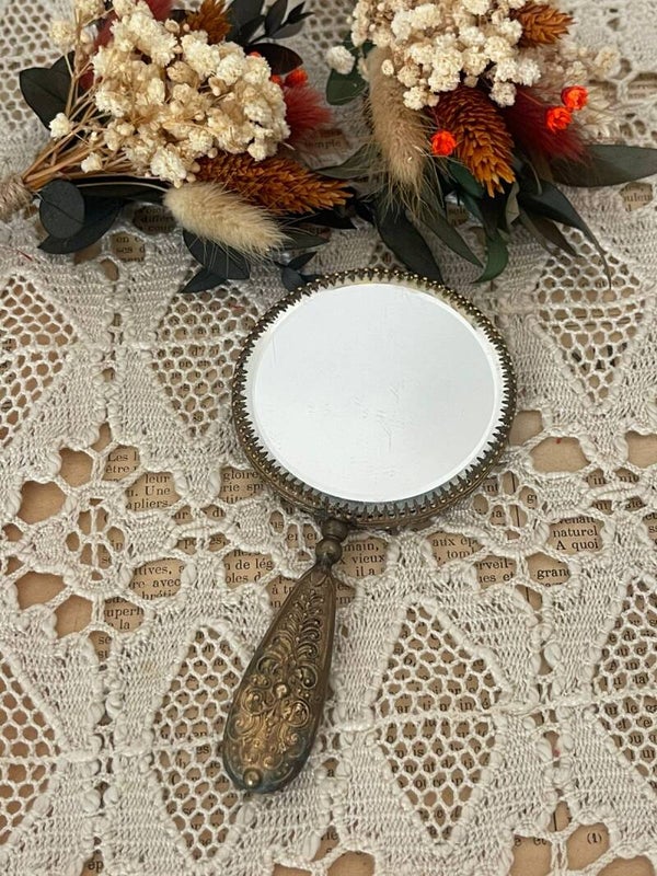 Ce délicat miroir à main, probablement en laiton, tient dans la paume comme un précieux secret du passé. Ancien et orné d'une jolie patine, il dévoile un manche finement décoré de motifs floraux, évoquant les dentelles végétales d’autrefois. Tout autour du miroir biseauté, une couronne de détails ciselés, semblables à de petits pics ou aux motifs d’un vitrail ancien, vient souligner son caractère singulier.