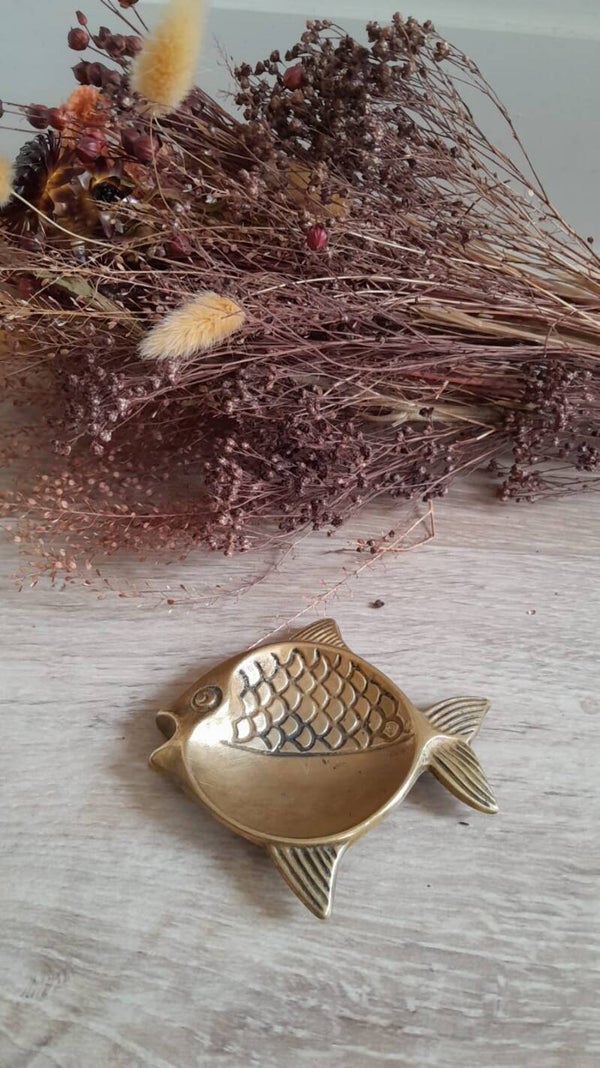 Voici un charmant vide-poche en laiton, évoquant la grâce et la douceur d’un poisson des profondeurs marines. Large de 10 cm et haut de 9 cm, ce petit objet arrondi s’appuie sur trois délicats petits pieds, lui conférant une présence raffinée et presque flottante. Sa silhouette classique se dessine avec soin : deux nageoires délicates sur le dessus, une queue fine à droite, et un petit œil malicieux juste au-dessus d’une bouche entrouverte, qui invite à la contemplation.