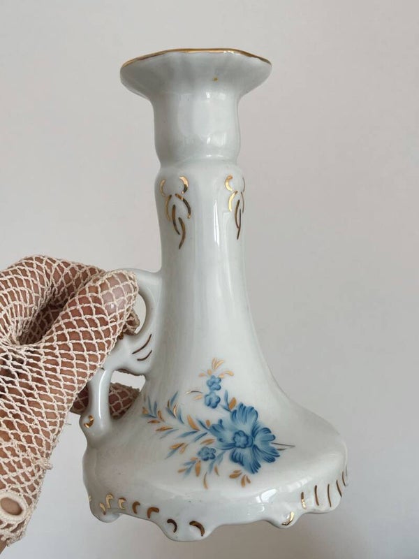 Bougeoir en porcelaine décoré de fleurs bleues et dorures