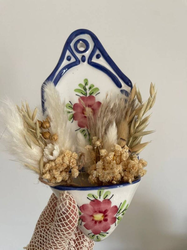 Ce décor finement peint à la main, sans être trop chargé, apporte une touche de douceur et de fraîcheur. Idéal pour une décoration bohème ou champêtre, ce bénitier peut accueillir fleurs fraîches ou séchées, offrant ainsi une alternative charmante à son usage traditionnel.