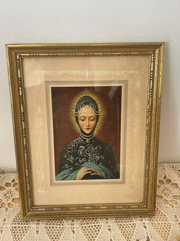 Ce cadre ancien, sobre et élégant, abrite une lithographie représentant une sainte vêtue d'une robe distinguée, parée de bijoux en perles et or, et portant une auréole. Elle lève les mains sous un châle, le regard tourné vers le bas à droite, dans une posture empreinte de sérénité.