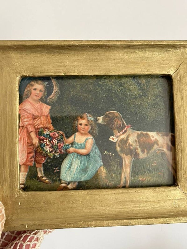 Petit cadre doré et carte postale ancienne – Enfants au panier de fleurs
