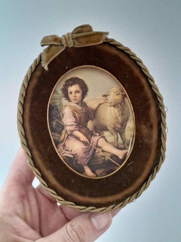 Petit cadre ovale en velours brun – Jeune fille à la brebis
