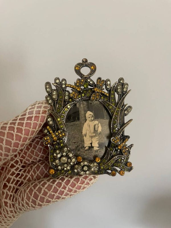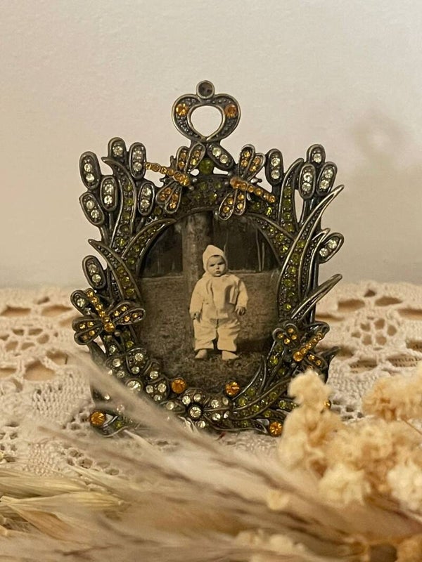 Ce minuscule cadre photo, à peine plus haut qu’une carte de visite, est un concentré de poésie végétale. Réalisé en métal argenté, il adopte les courbes élégantes du style Art nouveau, où tout semble vivant : des libellules légères, des fleurs délicates, des tiges souples et même de jolies quenouilles – ces fameuses plantes des marais à tête brune, si reconnaissables.