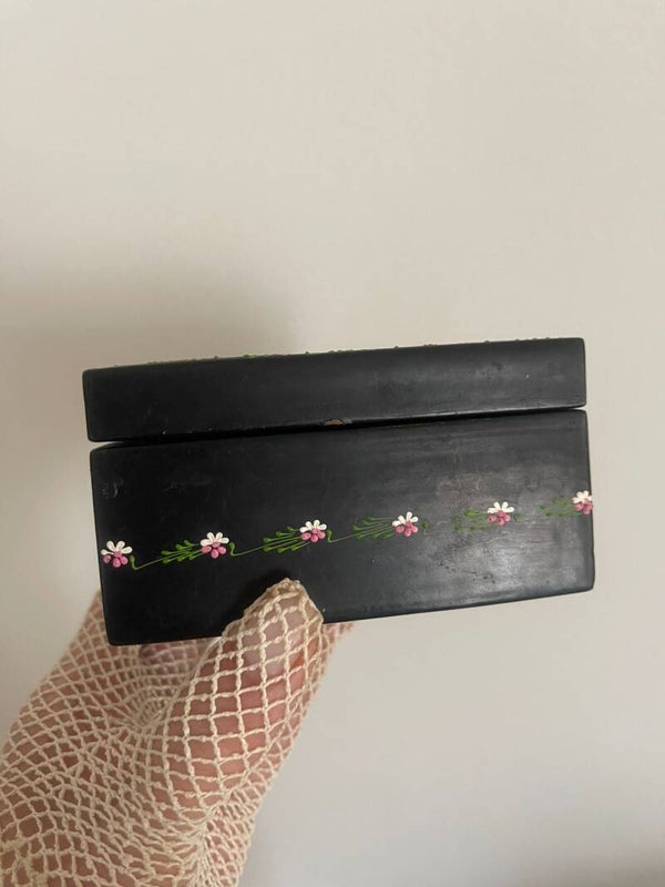 Charmante boîte en bois peinte en noir, au format compact et rectangulaire, parfaite pour y glisser quelques trésors ou secrets bien gardés. Tout autour du couvercle, de délicats motifs floraux peints à la main viennent border l’ensemble avec soin. Mais c’est en son centre que l’œil se pose : un grand bouquet foisonnant, tout en panaché, composé de tiges vertes et de petites fleurs aux teintes tendres – rose pâle et blanc – évoquant des pâquerettes en habits de fête.