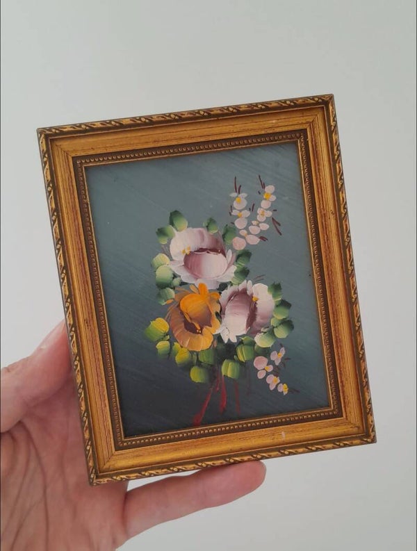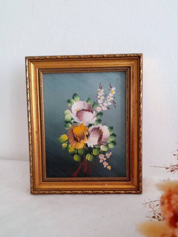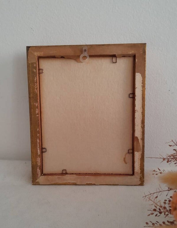 Ce cadre délicat de 11,5 cm de large sur 14,5 cm de haut, en bois doré orné de petits liserés, dégage un charme ancien et élégant. Son format raffiné met en valeur une peinture réalisée à la main sur carton, un véritable petit trésor pour les amateurs d’art intimiste.