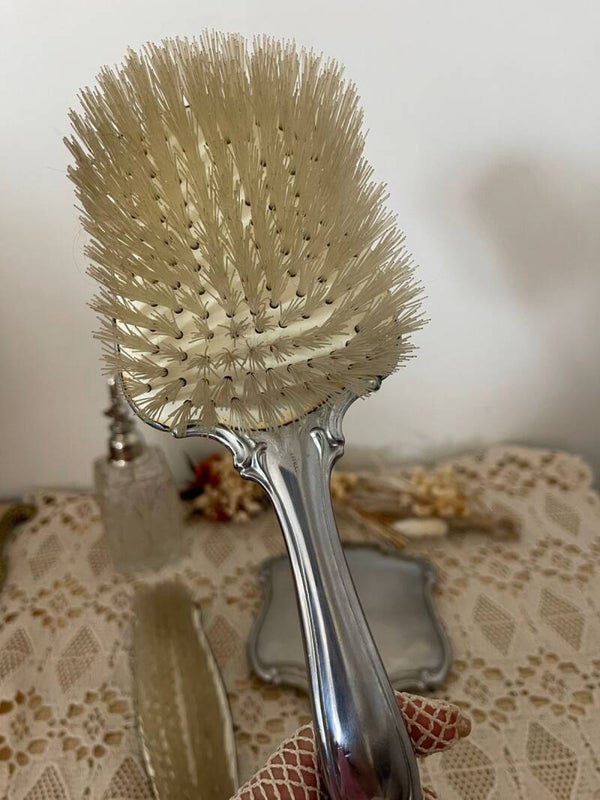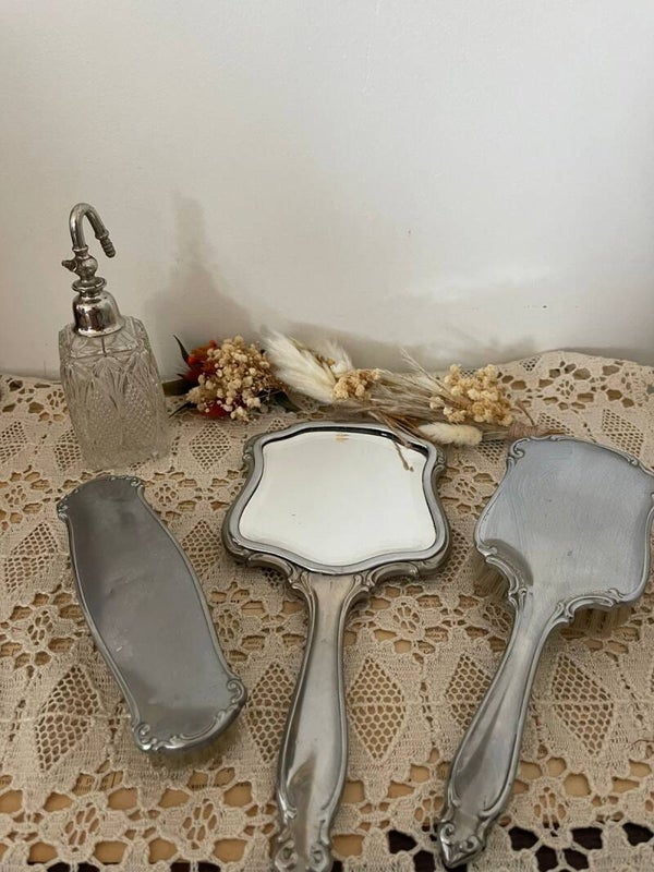 Voici un ensemble de coiffure qui semble tout droit sorti d’un boudoir du passé : un miroir, une brosse à main et une brosse rectangulaire, tous trois en métal argenté, aux formes douces et sinueuses, presque dansantes. Leurs lignes rappellent les volutes baroques, sans excès, avec juste ce qu’il faut de raffinement discret pour attirer le regard.