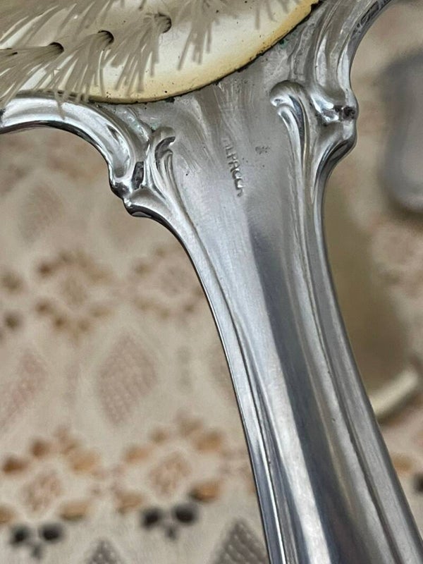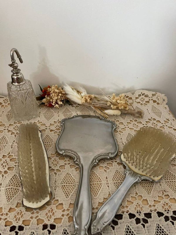 Le miroir est en parfait état, éclatant et net, tandis que la brosse à main présente un choc visible sur le dos, et que la brosse rectangulaire arbore également une petite bosse. Ces traces du temps, mineures au regard de leur âge, n’enlèvent rien à leur charme : elles racontent une histoire silencieuse, empreinte d’élégance et de quotidien.