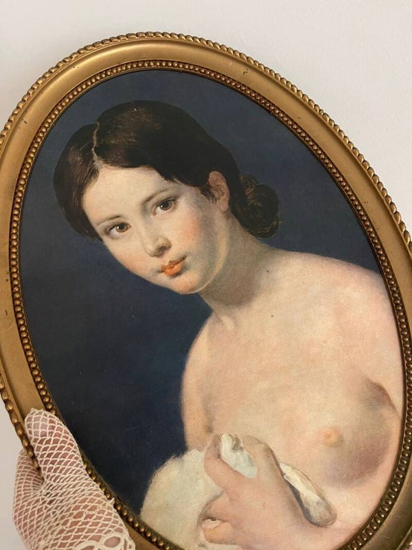 Ce cadre ovale en bois doré, finement travaillé avec deux petits liserés élégants sur le pourtour intérieur et extérieur, met en valeur une image pleine de mystère et de finesse. L’impression est réalisée par un procédé ancien appelé phototypie, une technique d’impression née au milieu du XIXe siècle qui a révolutionné la reproduction d’images. Très prisée entre 1860 et 1900, la phototypie permettait de capturer avec une grande précision les nuances et les détails d’un original, offrant un rendu tout en douceur, souvent en noir et blanc ou en tons sépia. Cette méthode utilisait des plaques sensibles à la lumière pour reproduire fidèlement les ombres et les textures, rendant la technique idéale pour les portraits et les œuvres d’art, avant l’avènement des procédés photographiques modernes. Elle représentait une alternative plus accessible et plus rapide que la gravure traditionnelle, ce qui explique sa popularité à cette époque.