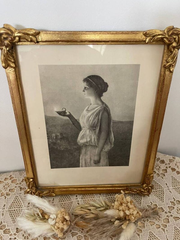 Au centre, une lithographie en noir et blanc révèle le portrait d’une jeune femme tenant une petite lampe à huile ancienne — ou un bougeoir — dont la lumière douce éclaire avec délicatesse sa robe blanche et sa peau claire. En arrière-plan, des collines et quelques habitations ajoutent une profondeur paisible à la scène, renforçant son atmosphère tranquille et harmonieuse.