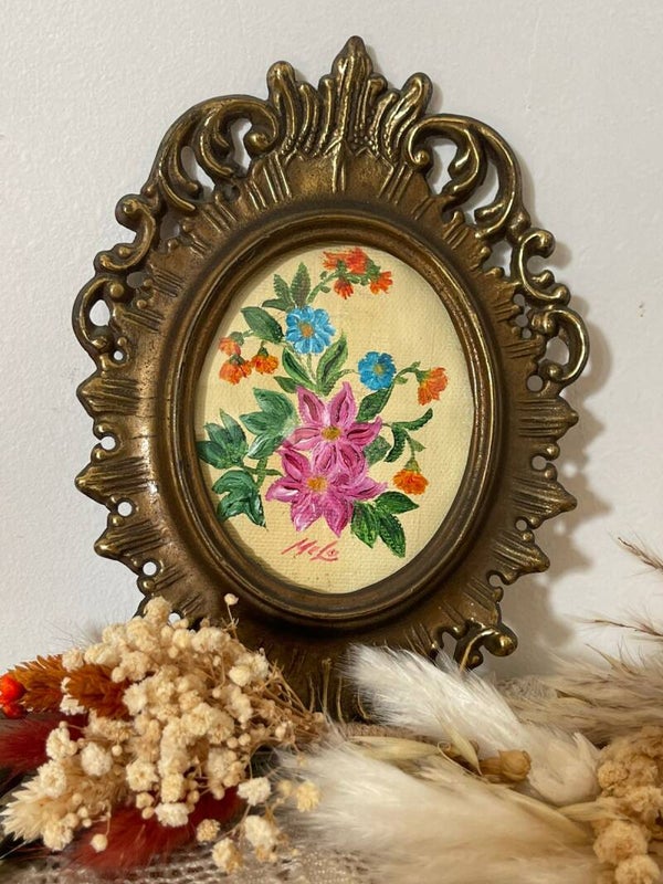 Ce joli cadre d’inspiration baroque, tout en courbes élégantes et détails sculptés, encadre une peinture florale récente, réalisée à la main. La composition, pleine de fraîcheur, évoque un bouquet champêtre : petites clochettes orangées, deux grandes fleurs roses et deux fleurs bleues s’y mêlent dans une harmonie douce et lumineuse.