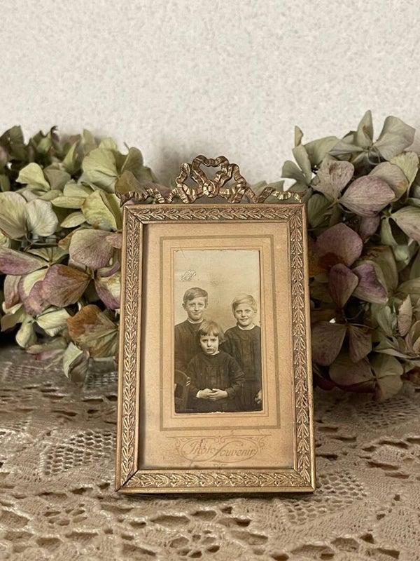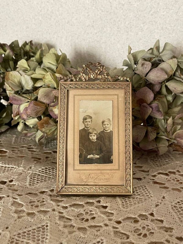 À l’intérieur, un cadre en papier blanc d’origine, marqué de l’inscription « Photos souvenirs » dans une jolie typographie, entoure une véritable photographie de trois enfants posant devant l’objectif. Le papier, jauni et marqué par les années, est clairement patiné par le temps — un détail visible, qui contribue au charme d’un objet resté dans son jus. Il pourra être conservé tel quel pour son authenticité ou remplacé selon l’usage souhaité.