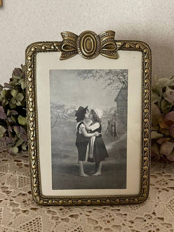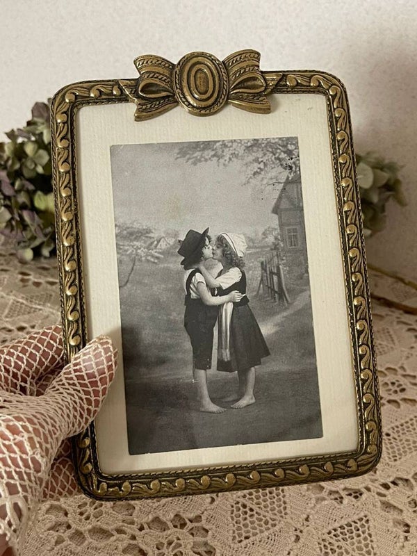 Un souffle tendre et doré se dégage de ce ravissant cadre photo ancien. En métal doré, dans un ton qui rappelle le laiton patiné, il est souligné d’un liseré d’environ un centimètre, finement orné de motifs ondulants, presque comme des petites vagues. Tout en haut, un ruban stylisé noué autour d’un bouton central vient parfaire l’ensemble, apportant une délicatesse toute romantique.