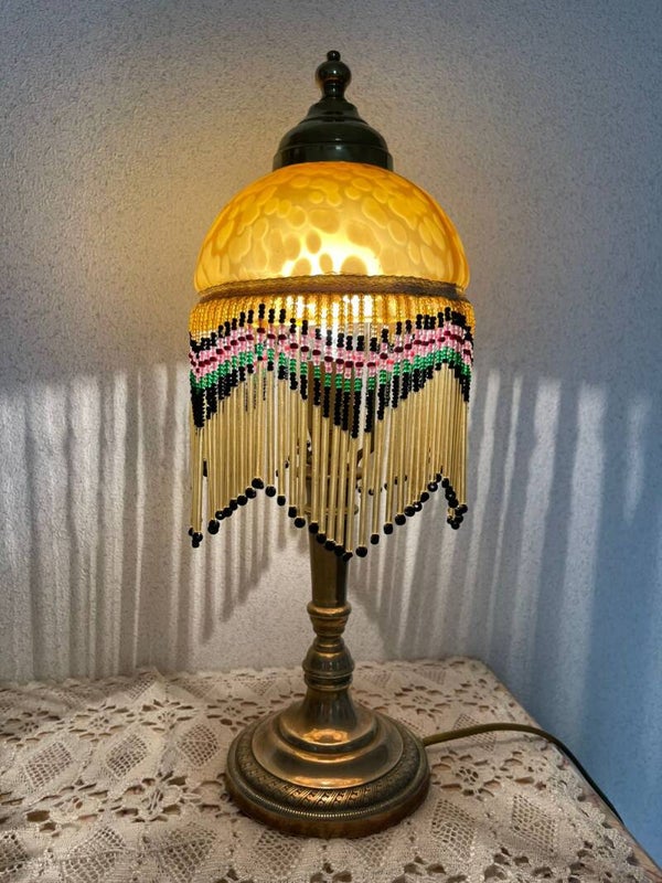 Autour de l’abat-jour, une frange de perles suspendues forme un motif délicat aux accents graphiques : rose, vert, noir et or s’entrelacent en une bordure en V rappelant des fanions. Ces pampilles, très bien travaillées, créent un effet visuel saisissant, à la fois rétro et plein de poésie.