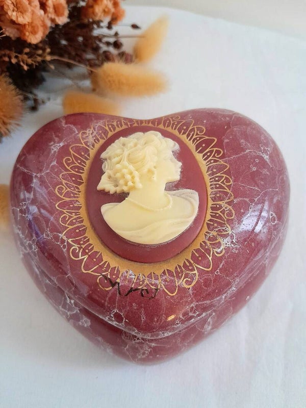 En forme de cœur généreux et délicatement bombé, ce coffret à bijoux en porcelaine marbrée rose et blanche respire l’élégance d’un autre temps. Sur son couvercle trône un camée raffiné représentant une jeune femme bourgeoise, coiffée à la mode d’hier, encadrée de fines arabesques dorées.