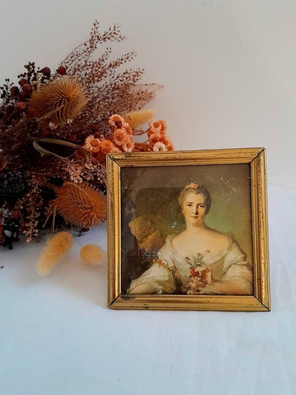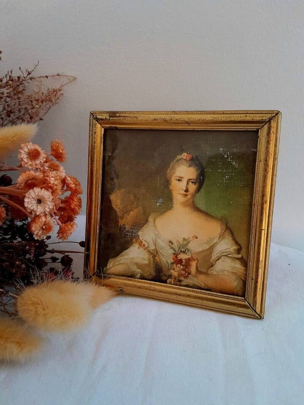 Ce petit cadre carré en métal doré dégage un doux parfum d'élégance surannée. Protégé par une fine vitre, il renferme l’impression délicate d’une jeune bourgeoise au regard franc, tourné vers le spectateur. Dans ses mains, un petit bouquet de fleurs, comme un détail secret. Le fond nuageux, dans des teintes chaudes mêlant vert et orangé, donne à la scène une atmosphère tendre et presque rêveuse.